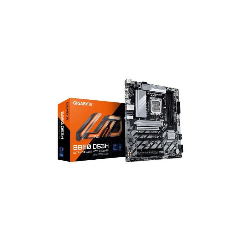 GIGABYTE B860 DS3H Carte mère - Processeurs Intel Core Ultra, VRM 8+1+2+2 phases, jusqu'à 9066MHz DDR5, 1xPCIe 5.0 + 1xPCIe 4.0 M.2, LAN 2,5 GbE, USB 3.2 Gen 2x2. Fabricant de processeur: Intel, Socket de processeur (réceptable de processeur): LGA 1851 (Socket V1), Processeurs compatibles: Intel Core Ultra (série 1), Intel Core Ultra (Series 2). Types de mémoire pris en charge: DDR5-SDRAM, Mémoire interne maximale: 256 Go, Type de support (slot): DIMM. Interfaces de lecteur de stockage prises en charge: M.2, SATA III, Types de lecteurs de stockage pris en charge: HDD & SSD, Niveaux RAID: 0, 1, 5, 10. Résolution maximale: 4096 x 2160 pixels. Type d'interface Ethernet: 2.5 Gigabit Ethernet, Contrôleur de réseau local (LAN): Realtek RTL8125