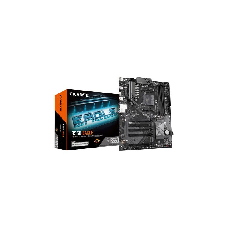 GIGABYTE B550 EAGLE Carte mère - Processeurs AMD Ryzen série 5000 G, VRM 10+3+1 phases, jusqu'à 3200 MHz DDR4, 1xPCIe 4.0 + 1xPCIe 3.0 M.2, LAN 1GbE, USB 3.2 Gen 2. Fabricant de processeur: AMD, Socket de processeur (réceptable de processeur): Emplacement AM4, Processeurs compatibles: AMD Ryzen 3000 Series, AMD Ryzen 4000 Series, AMD Ryzen 5000 Series. Types de mémoire pris en charge: DDR4-SDRAM, Mémoire interne maximale: 128 Go, Type de support (slot): DIMM. Interfaces de lecteur de stockage prises en charge: M.2, PCI Express 4.0, SATA III, Types de lecteurs de stockage pris en charge: HDD & SSD, Niveaux RAID: 0, 1, 10. Résolution maximale: 4096 x 2160 pixels. Type d'interface Ethernet: Gigabit Ethernet, Contrôleur de réseau local (LAN): Realtek RTL8111H