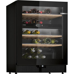 Cave à vin de service posable Serie 3 - Cette cave à vin de service peut accueillir jusqu'à 34 bouteilles, idéale pour conserver et mettre en valeur votre collection. Dotée d'une porte vitrée anti-UV à triple épaisseur, elle protège les vins des rayons qui peuvent altérer leur qualité. L'éclairage LED, sans émission de chaleur, assure une visibilité parfaite. Son système anti-vibration monté sur Silent Blocs réduit les micro-vibrations, offrant des conditions optimales de vieillissement et un niveau sonore réduit à 37 dB pour un confort maximal. La connectivité Wi-Fi via l'application hOn vous permet de gérer votre inventaire, d'obtenir des recommandations et de contrôler la température à distance. Avec une zone unique et un froid statique, elle maintient une température stable entre 5°C et 20°C. - Finition noir.