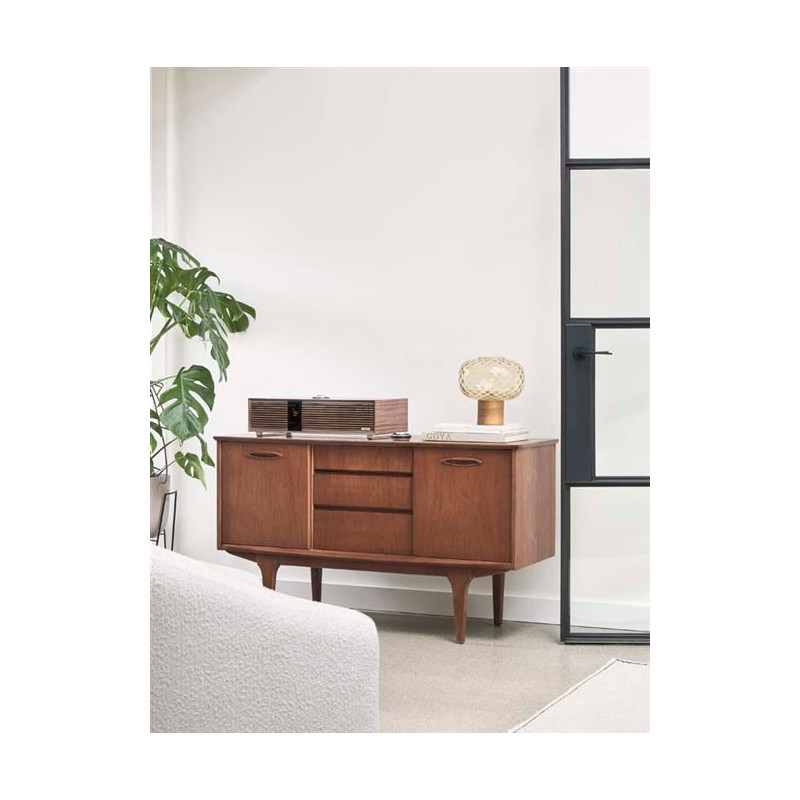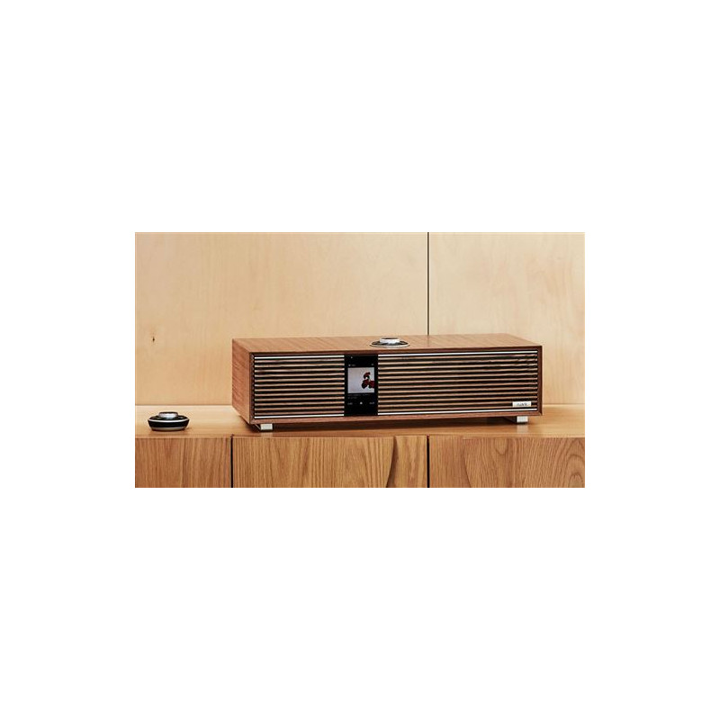 Le R410 adopte une allure inédite, ostensiblement repensée mais familière, aux lignes modernes et bien marquées, et toujours insufflées d’une aura seventies élégante. On y retrouve le fameux contrôleur RotoDial, et une grille à lamelles en bois éco conçu - tout comme le reste du coffre d’ailleurs - comme de délicats rappels de l’ADN - et des modèles fétiches R1 et R2 - de la maison. Un sublime écran haute résolution couleur TFT de 10 cm à l’orientation verticale furieusement actuelle parachève l’allure rétro moderne du système.