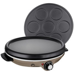 Pour des goûters ou des petits-déjeuners délicieux ! Large plaque chauffante de 30 cm de diametre Revetement anti-adhésif Spatule et répartiteur inclus Thermostat réglable manuellement entre 165°et 230° Pieds anti-dérapants Témoins lumineux d`indication Puissance : 2000 W