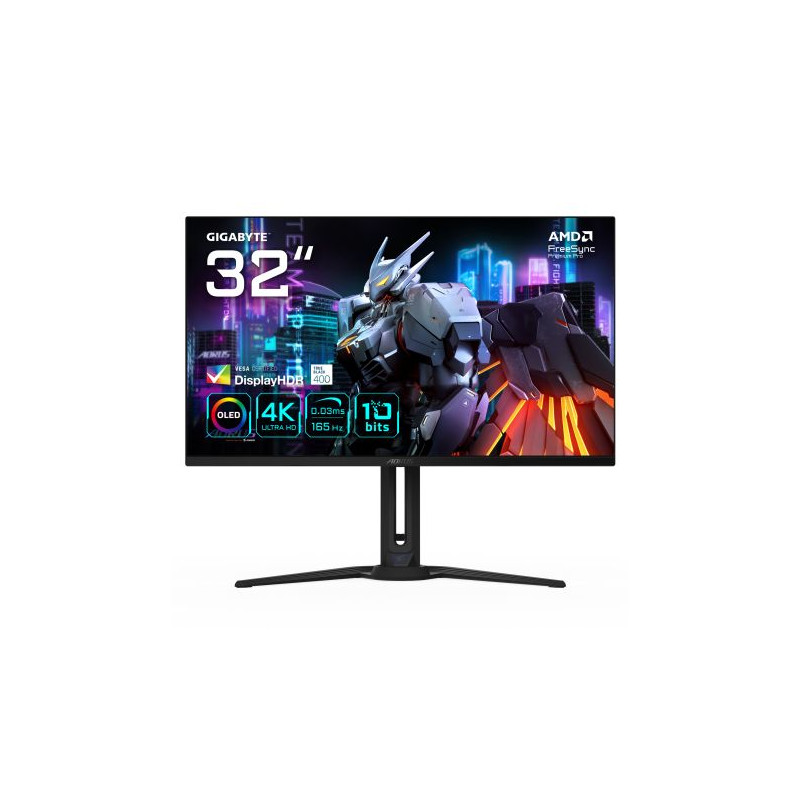 GIGABYTE AORUS FO32U 31,5” Moniteur de jeu UHD - 3840 x 2160 (UHD), 165Hz, 0,03ms, 250 cd/m², FreeSync Premium Pro, DisplayHDR True Black 400, HDMI 2.1, DisplayPort 1.4. Taille de l'écran: 80 cm (31.5"), Résolution de l'écran: 3840 x 2160 pixels, Type HD: 4K Ultra HD, Technologie d'affichage: OLED, Temps de réponse: 0,03 ms, Format d'image: 16:9, Angle de vision horizontal: 178°, Angle de vision vertical: 178°. Haut-parleurs intégrés. Concentrateur USB intégré. Montage VESA, Réglage de la hauteur. Couleur du produit: Noir