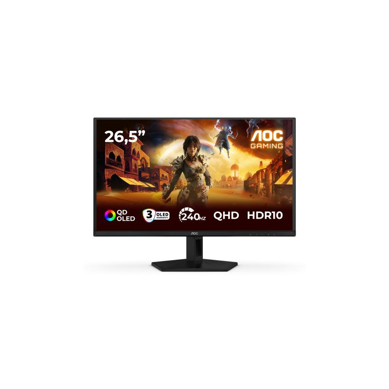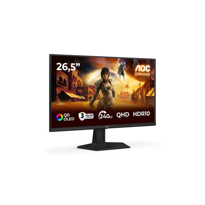 AOC G4 Q27G41ZDF. Taille de l'écran: 67,3 cm (26.5"), Résolution de l'écran: 2560 x 1440 pixels, Type HD: Quad HD, Technologie d'affichage: QD-OLED, Temps de réponse: 0,03 ms, Format d'image: 16:9, Angle de vision horizontal: 178°, Angle de vision vertical: 178°. Concentrateur USB intégré. Montage VESA. Couleur du produit: Noir, Rouge