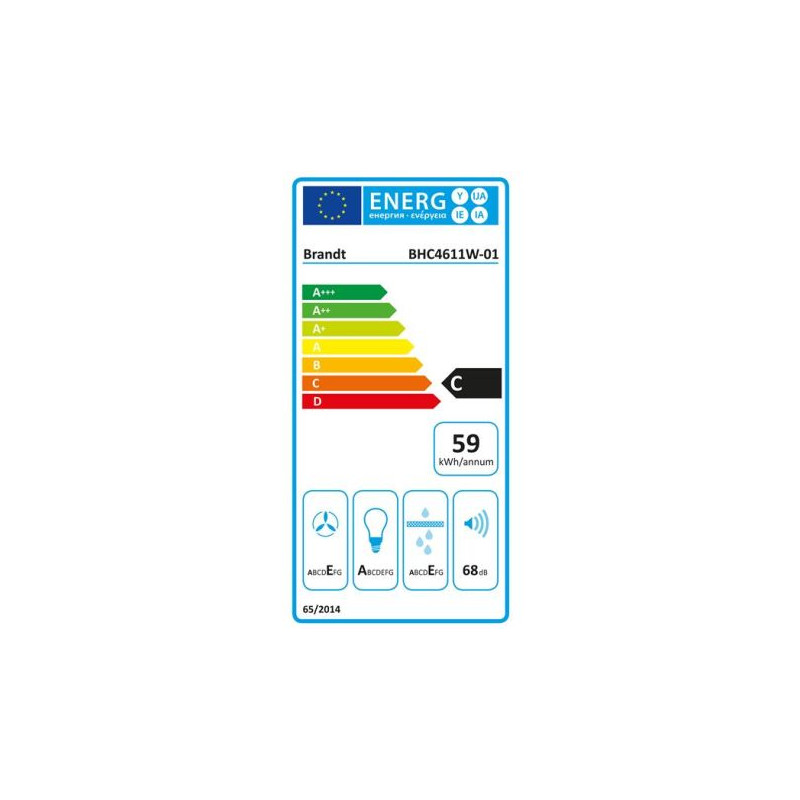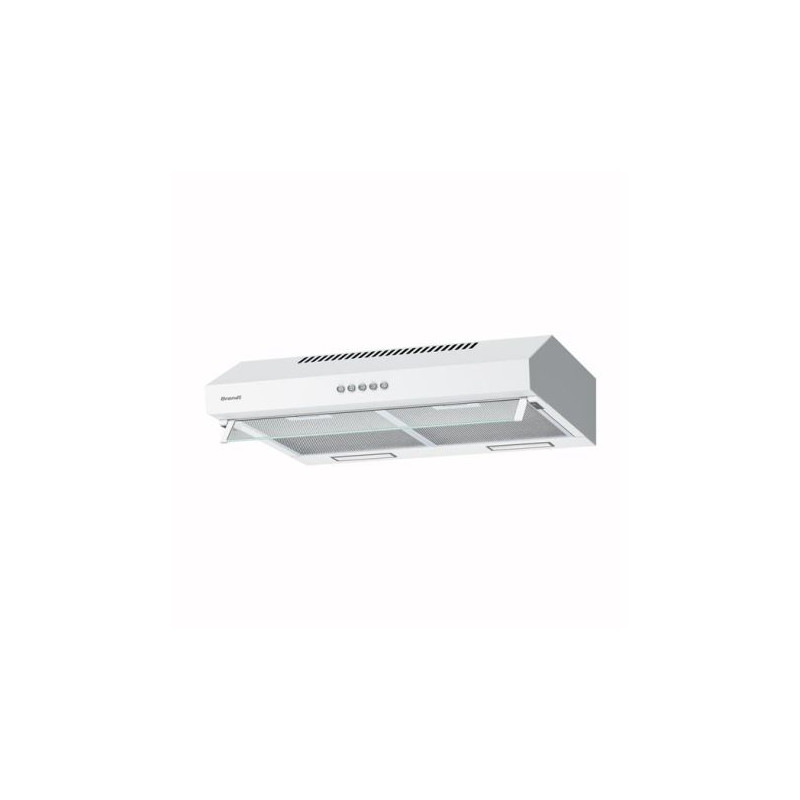 Hotte visière Brandt BHC4611W - Elle propose 3 vitesses pour adapter la puissance d’aspiration à vos besoins - Ses commandes mécaniques par touches assurent une utilisation simple et intuitive - Elle offre des fonctions essentielles comme l’éclairage indépendant, la mise en marche/arrêt et la sélection des vitesses - Équipée de 2 filtres à graisse en aluminium lavables à la main, elle est livrée avec un filtre à charbon de série (référence CF180) qui permet une utilisation immédiate en mode recyclage - L’éclairage LED, composé de 2 lampes d’une puissance totale de 4 W, garantit un confort visuel optimal tout en limitant la consommation énergétique - Le diamètre de sortie est de 120 mm, accompagné d’un clapet anti-retour et d’un déflecteur pour plus d’efficacité - Finition blanc.