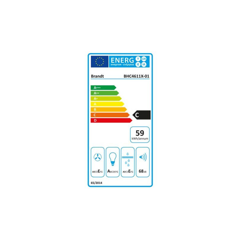 Hotte visière Brandt BHC4611X - Elle propose 3 vitesses pour adapter la puissance d’aspiration à vos besoins - Ses commandes mécaniques par touches assurent une utilisation simple et intuitive - Elle offre des fonctions essentielles comme l’éclairage indépendant, la mise en marche/arrêt et la sélection des vitesses - Équipée de 2 filtres à graisse en aluminium lavables à la main, elle est livrée avec un filtre à charbon de série (référence CF180) qui permet une utilisation immédiate en mode recyclage - L’éclairage LED, composé de 2 lampes d’une puissance totale de 4 W, garantit un confort visuel optimal tout en limitant la consommation énergétique - Le diamètre de sortie est de 120 mm, accompagné d’un clapet anti-retour et d’un déflecteur pour plus d’efficacité - Finition inox avec bandeau en verre noir.