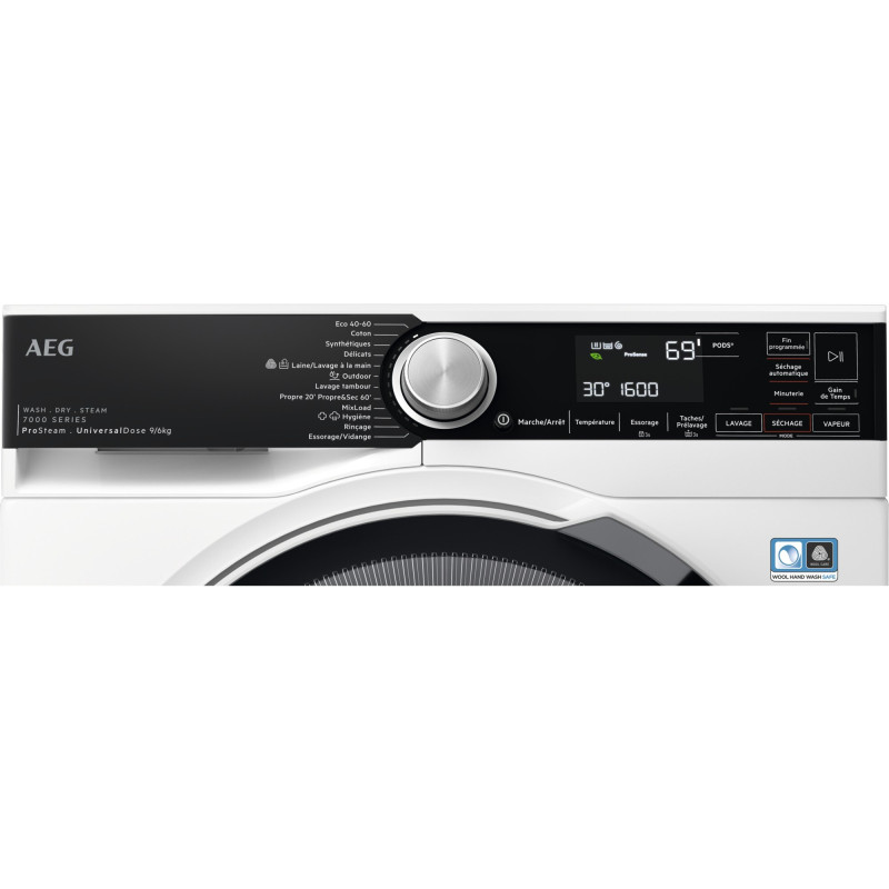 Lave-linge séchant série 7000 - 12 programmes dont Laine certifié Woolmark Blue en lavage et séchage - Options Prélavage, Taches, Gain de temps et Minuterie - La technologie DualSense® adapte la température et les mouvements du tambour aux différents types de textiles. Elle ajuste le programme en fonction de la charge. Tous les vêtements sont lavés et séchés avec soin - PreciseLoad adapte automatiquement la durée du cycle, la consommation d'eau et d'énergie, selon le poids de la charge de linge - SpecialCare Wash-to-Dry assure un lavage doux et efficace pour votre linge du quotidien, y compris les lainages et les vêtements délicats - La touche mode Lavage & séchage vous permet de choisir un programme pour laver et sécher en une seule fois, ou de laver et de sécher séparément si vous n'avez besoin que d'une seule fonction - Steam Refresh neutralise les odeurs et réduit les plis de votre linge, y compris les tissus délicats, en seulement 25 minutes - UniversalDose permet d'utiliser tous types de lessive, y compris les PODS® - Moteur ÖKO Inverter - Turbo séchage électronique par condensation - Tambour Protex 69 litres - Isolation phonique renforcée - Départ différé jusqu'à 20 heures - Affichage du temps restant sur écran LED blanc - Sécurités enfants et anti-débordement - Conso Lavage (9kg) : 0,49 kWh / 46 L - Conso Lavage + séchage (6kg) : 3,07 kWh / 75 L.