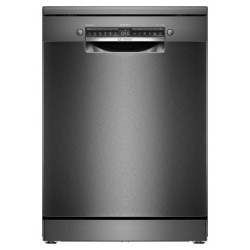 Performance et consommation Classe d'efficacité énergétique¹ C sur une échelle allant de A à G Energie² / Eau³ : 75 kWh / 9 litres 14 couverts Durée progr. Eco⁴ : 4:55 (h:min) Niveau sonore : 46 dB(A) re 1 pW Niveau sonore progr. Silence : 45 Classe d'efficacité sonore : C Moteur EcoSilence Drive Caractéristiques principales 6 programmes : Eco 50 °C, Auto 45-65 °C, Intensif 70 °C, Programme 1h 65 °C, Silence 50 °C, Favourite (Pré-rinçage) 4 options : Home Connect, Séchage extra, Demi-charge, SpeedPerfect+ (3 fois plus rapide) Home Connect : contrôle et diagnostic à distance Machine Care Pre-Rinse Fonctions complémentaires via l’application Home Connect : HygienePlus, Silence à la demande Confort et sécurité Echangeur thermique qui protège la vaisselle AquaSensor qui détecte le degré de salissure Système Super Brillance, conserve l'éclat des verres Boîte à produits MaxiPerformance AquaStop : garantie Bosch en cas de dégât des eaux - pour toute la durée de vie de l'appareil* Signal sonore de fin de cycle Départ différé : 1-24 h Triple filtre autonettoyant Design Display sur la tranche (int.) Boutons sur la tranche Inscriptions en texte clair InfoLight rouge Flexibilité Paniers VarioFlex Tiroir à couverts Panier supérieur réglable avec RackMatic (3 niveaux) Panier supérieur avec 2 rangées de picots rabattables Panier inférieur avec 4 rangées de picots rabattables Supports pour tasses dans le panier supérieur (2x) Roues à faible frottement sur panier inférieur et tiroir Butée (stopper) qui empêche le déraillement du panier inférieur Accessoires Protection anti vapeur Caractéristiques techniques Dimensions du produit (HxLxP) : 81.5 x 59.8 x 55 cm Cuve polinox