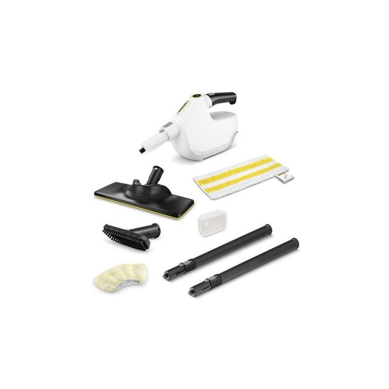 Balai vapeur multi-fonctions SC 1 Multi & Up - Kärcher - Découvrez le SC 1 Multi & Up, un balai vapeur ultra-polyvalent qui s’adapte à tous vos besoins grâce à son concept unique 3-en-1 - Utilisable en balai vapeur, en position intermédiaire ou en défroisseur manuel, il nettoie efficacement les surfaces du sol aux textiles - Prêt à l’emploi en seulement 30 secondes, il est équipé d’un affichage LED et d’une cartouche de détartrage automatique pour un entretien simplifié - Son réservoir amovible de 200 ml permet une alimentation continue en vapeur sans interruption - Doté d’une puissance de chauffe de 1300 W et d’un câble de 5 m, il garantit une liberté de mouvement optimale - Son système EasyFix Large assure une fixation rapide de la serpillère et un nettoyage hygiénique sans contact avec la saleté - Livré avec une bonnette en microfibres, une buse à main et un kit EasyFix Large, il offre une solution complète pour un intérieur propre et sain.