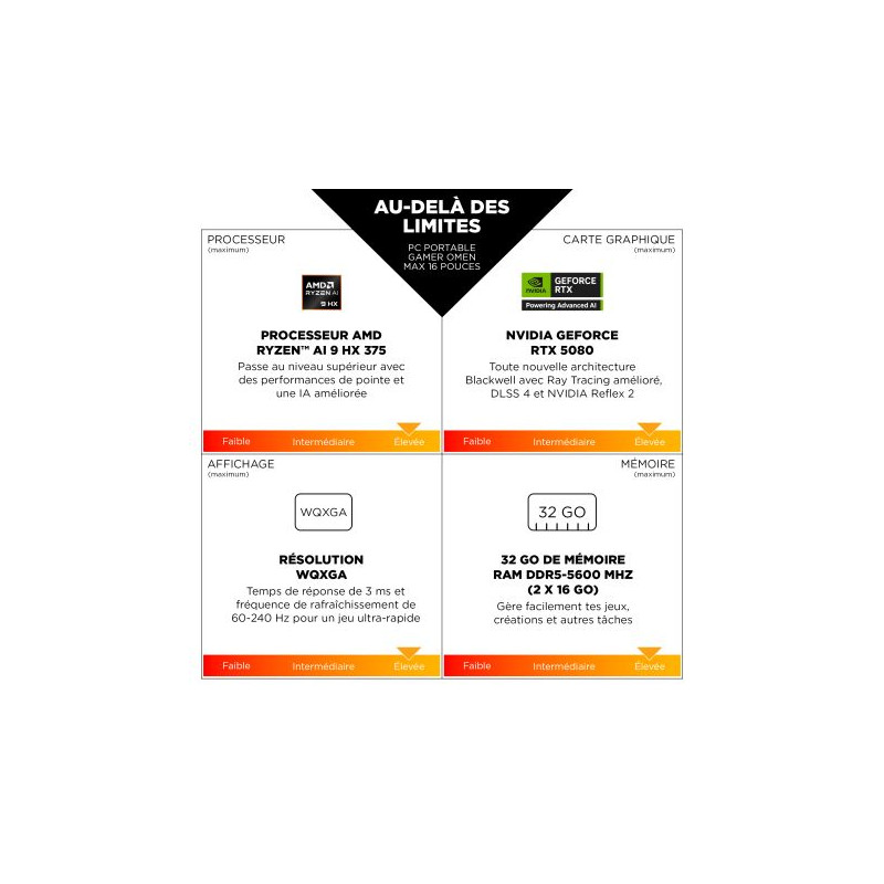 HP OMEN MAX Gaming 16-ak0002nf. Type de produit: Ordinateur portable, Format: Clapet. Famille de processeur: AMD Ryzen AI 7, Modèle de processeur: 350, Fréquence du processeur: 2 GHz. Taille de l'écran: 40,6 cm (16"), Type HD: WQXGA, Résolution de l'écran: 2560 x 1600 pixels. Mémoire interne: 32 Go, Type de mémoire interne: DDR5-SDRAM. Capacité totale de stockage: 1 To, Supports de stockage: SSD. Modèle d'adaptateur graphique inclus: AMD Radeon 860M. Système d'exploitation installé: Windows 11 Home. Couleur du produit: Noir