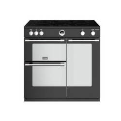 Fours de très grande capacité: maxi-grill de 37 L et grand four à chaleur pulsée de 94 L Rails télescopiques double extension: Pour un accès facile aux plats. Piano de cuisson, 90 cm Dessus induction, 2 fours électriques + 1 maxi gril, Programmateur digital, classe énergétique A Couleur noire, portes effet miroir Cuisson ultra précise grâce au réglage de la durée de chauffe par zone à induction