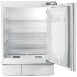 Réfrigérateur 1 porte 110 L dont compartiment 4* : 13 L - Compact et pratique, ce réfrigérateur est parfait pour les petits espaces ou en complément d’un appareil principal - Il offre une capacité nette totale de 110 L, avec 97 L pour le réfrigérateur et 13 L pour un compartiment congélateur intégré - Doté de 3 clayettes en verre réglables, d’un bac à légumes et de balconnets ajustables, il permet une organisation optimale pour vos aliments et boissons - Le système de refroidissement statique et le dégivrage automatique simplifient l’entretien au quotidien - Son éclairage LED illumine efficacement l’intérieur pour une visibilité parfaite - Avec un niveau sonore réduit à 35 dB, il garantit un environnement calme et agréable - Sa porte réversible offre une flexibilité d’installation adaptée à vos besoins - Classé E en efficacité énergétique, ce réfrigérateur allie performance et économie d’énergie - Avec des dimensions compactes de 866 x 545 x 545 mm, il s’intègre facilement dans tous les styles de cuisine - Fixation de porte par glissières. Cet appareil est intégrable. Il est livré sans habillage ni porte décorative, afin de vous permettre de l'assortir au mobilier et à la couleur de votre cuisine.