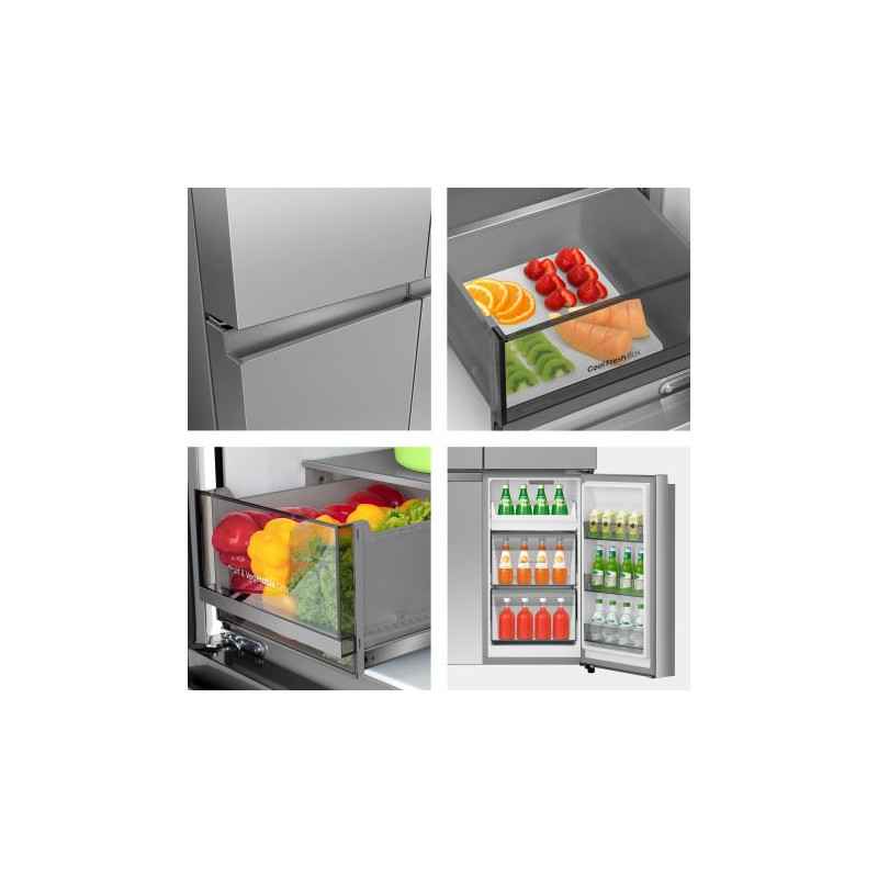 Hisense RQ5P640SSSD. Placement de l'appareil: Pose libre, Conception du produit: Américain, Couleur du produit: Acier inoxydable. Capacité nette totale: 647 L, Classe climatique: SN-N, Classe d'émission sonore: B. Capacité nette du réfrigérateur: 397 L, Type de lampe: LED. Capacité net du congélateur: 250 L, Emplacement du compartiment à glace: Bas-placé, Capacité de congélation: 6 kg/24h. Longueur du câble: 2 m, Apps de contrôle prises en charge: ConnectLife