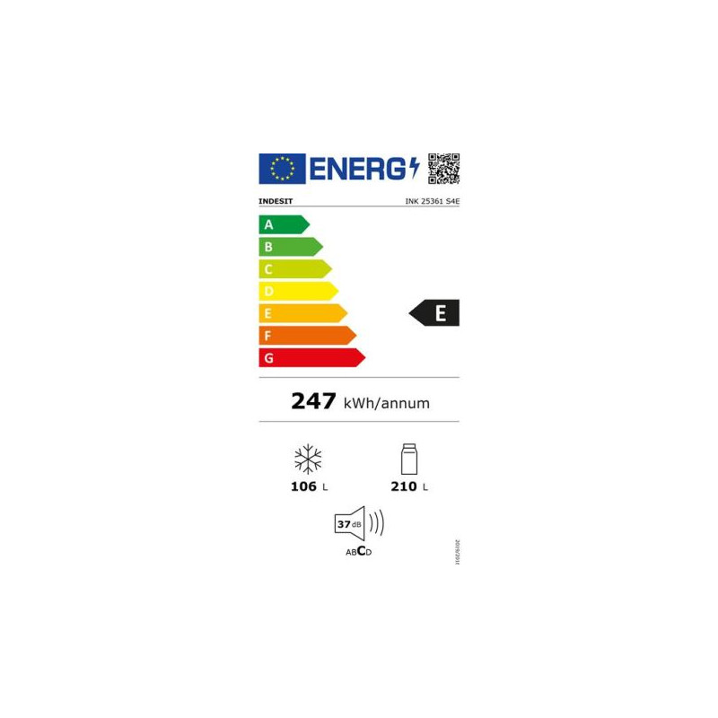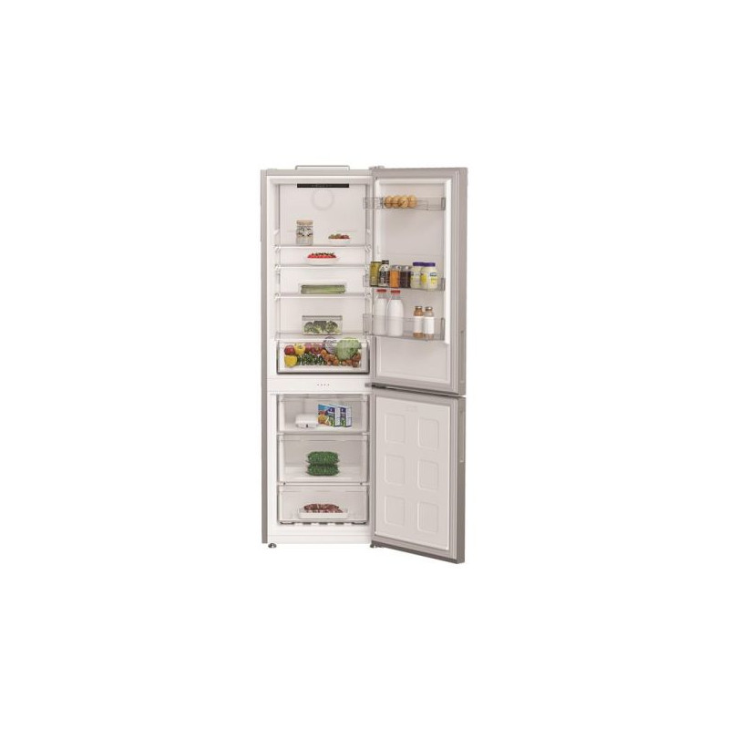Réfrigérateur combiné Indesit INK25361S4E - Ce combiné pose-libre finition inox propose une capacité totale de 316 L pour conserver efficacement vos produits frais et surgelés - Le réfrigérateur de 210 L fonctionne en froid ventilé Dual No Frost pour un froid homogène sans formation de givre - Le congélateur 4* de 106 L bénéficie également de cette technologie avec ses deux circuits indépendants pour éviter tout mélange d’odeurs et préserver les textures - La fonction Push&Go permet un refroidissement express à -1 °C dans la partie réfrigérateur, idéale pour la remise au froid rapide après vos courses - L’aménagement intérieur comprend 4 clayettes en verre dont 3 ajustables, 1 bac à légumes et 3 balconnets réglables - Côté congélation, vous disposez de 3 tiroirs spacieux - L’éclairage LED vous offre une excellente visibilité - Le thermostat électronique et l’affichage interne permettent un contrôle simple et précis de la température.