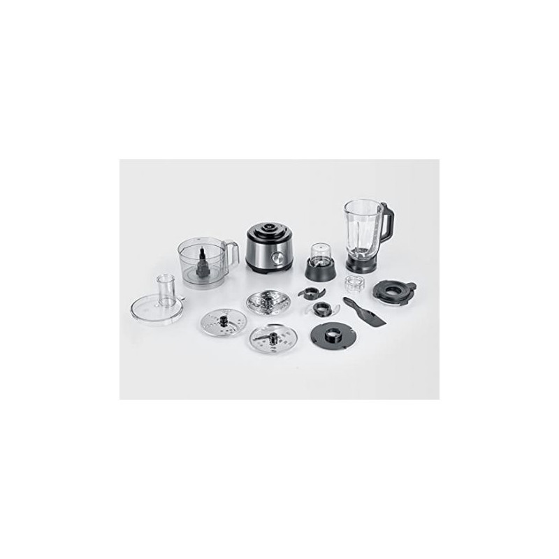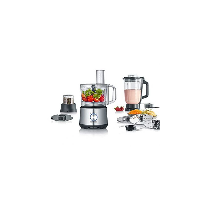 Robot polyvalent : Râper, frotter, couper, pétrir, mélanger, écraser, broyer et émulsionner avec un seul appareil. Vous ne pourrez plus vous en passer en cuisine Blendeur sur pied de 1,5 L, avec disque émulsifiant pour mayonnaise, pesto et crochet à pétrir pour préparation de pâte à pizza ou à pain. Moulin à épices de 140 ml avec fixation et couteau en inox idéal pour moudre les épices ou les grains de café Récipient de 1,5 l, avec 3 disques 2 en 1 pour râper grossièrement, en tranches moyennes ou râper finement - couteau en inox idéal pour broyer la viande Design élégant en inox avec bouton rotatif à éclairage bleuté - 2 vitesses d`utilisation + Fonction pulse Qualité allemande – Garantie 2 ans - Les produits SEVERIN sont performants par leur conception, leur facilité d`utilisation et leur durée de vie