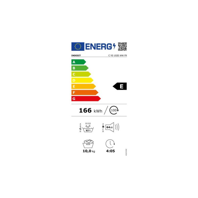Sèche-linge à pompe à chaleur Indesit CYD102DWWFR - Avec une capacité généreuse de 10 kg et un séchage électronique, il s’adapte à tous les types de linge du quotidien - Ses 15 programmes couvrent tous les besoins : du coton classique au linge de lit en passant par les textiles délicats ou sportifs - Il propose aussi un programme express de 30 minutes idéal pour les petites charges - Les nombreuses options comme le départ différé jusqu’à 24h, le niveau et le temps de séchage personnalisables ou encore le mode anti-plis offrent un confort d’utilisation appréciable - Les voyants d’entretien (filtre, réservoir, condenseur) et l’indicateur du temps restant vous facilitent la vie au quotidien - Son moteur universel assure des performances fiables et son tambour inox de 110 L préserve vos textiles - Côté sécurité, il est équipé d’un verrouillage enfant et d’un éclairage intérieur - Côté look, son design épuré blanc s’intègre facilement dans tous les intérieurs.