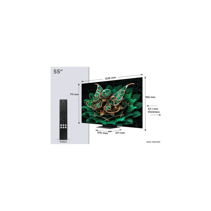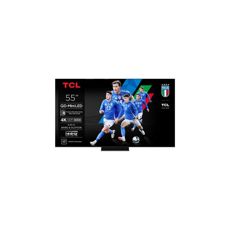 TV QD-Mini LED UHD 4K 139 cm TCL 55C7K - Entrez dans une nouvelle dimension d’image avec cette TV QD-Mini LED 4K de 139 cm combinant contraste extrême et précision ultime - Grâce à la technologie Quantum Dot Pro, les couleurs sont d’une richesse exceptionnelle et la dalle Mini LED avec 720 zones de rétroéclairage indépendantes assure des noirs profonds et une luminosité éclatante - La compatibilité HDR Dolby Vision IQ, HDR10+, HDR10 et HLG permet un rendu optimal des contenus, même dans des environnements lumineux changeants - Le panneau Crystglow HVA offre un contraste renforcé et des détails ultra précis dans chaque scène - Le processeur AiPQ Pro associé à l’upscaling UHD Deep Learning restitue des images nettes, fluides et naturelles en toutes circonstances - Côté plateforme, Google TV vous donne accès à un large catalogue d’applications comme Netflix, Prime Video, YouTube ou Apple TV+ avec la navigation facilitée par Chromecast intégré - Les joueurs profiteront pleinement de ses 4 HDMI 2.1, du taux de rafraîchissement 144 Hz natif, du VRR, FreeSync Premium Pro et de l’ALLM pour une réactivité optimale sans saccade - Pour l’audio, TCL fait appel à l’expertise de Bang & Olufsen avec une puissance de 60 W et woofer intégré, compatible Dolby Atmos et DTS Virtual-X, pour une immersion sonore haut de gamme - La télécommande RC833A est incluse avec piles fournies - Enfin, son design central ultra fin en aluminium brossé s’intègre parfaitement dans tous les intérieurs modernes et épuré. Garantie 2 ans constructeur.