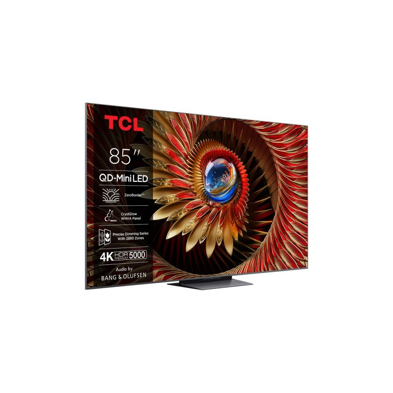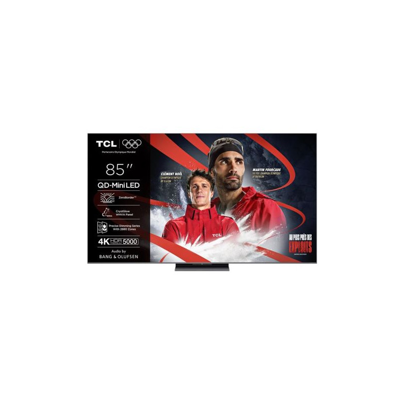 TV QD-Mini LED UHD 4K 215 cm TCL 85C8K - Plongez dans une image spectaculaire avec cette TV QD-Mini LED 4K de 215 cm, dotée d’un affichage 144 Hz natif pour une fluidité hors pair - Grâce à la technologie Quantum Dot Pro, vous profitez d’une gamme de couleurs riche, nuancée et fidèle, sublimée par un rétroéclairage Mini LED à 2880 zones pour un contraste localisé extrême - Le panneau Crystglow WHVA assure des noirs profonds et une homogénéité remarquable sur toute la dalle - Compatible avec les formats HDR Dolby Vision IQ, HDR10+, HDR10 et HLG, cette TV ajuste dynamiquement la luminosité et les détails selon la scène et la lumière ambiante - Le processeur AiPQ Pro, couplé à l’upscaling IA UHD, améliore chaque contenu avec une précision d’image exceptionnelle et une gestion avancée des couleurs calibrée en 3D LUT 17x17x17 - Google TV vous donne accès à vos applications préférées telles que Netflix, Prime Video, YouTube ou Apple TV+, avec Chromecast intégré pour une diffusion instantanée depuis vos appareils mobiles - Pensée pour les joueurs, elle dispose de 4 ports HDMI 2.1, du VRR, FreeSync Premium Pro et du mode ALLM, pour des sessions de jeu ultra fluides et sans latence - Le système audio signé Bang & Olufsen offre une puissance de 90 W, avec woofer intégré, Dolby Atmos et DTS Virtual-X pour une immersion sonore digne d’un home cinéma - La télécommande RC933A est fournie avec piles pour une utilisation immédiate - Son design sans bord (ZeroBorder™) en métal brossé donne à cette TV une allure moderne et premium, parfaitement adaptée aux intérieurs sophistiqués.
