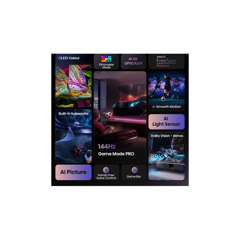 4K AI Upscaler, 144Hz Game Mode Pro, Game Mode, MEMC (Motion Estimation Motion Compensation), Quantum Dot Colour